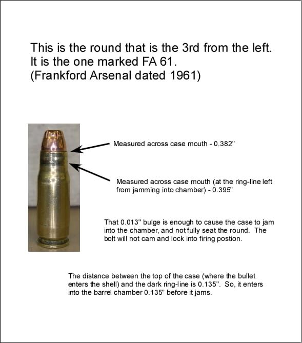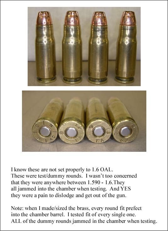 Got it! The site doesn't like to upload pictures with a dash ( - ) in the file name. But it doesn't mind spaces or underscores ( _ ). This is the round that I completely messed with. I hope the explanation and my findings help others. After seating the bullet and getting it jammed in the chamber (3-4 different times) the last time actually put a ring around the brass so I could see where it was dragging. Looking back, I should have gotten the black or blue felt marker and colored the end to see what was going on. Oh well, hindsight being foresight.... Not this round but a different round, after seating the bullet and taper crimping it, it jammed in the chamber. When I finally dislodged it, I tried running it through the sizer again. NO GO! It almost got stuck in my sizer. I wasn't going to "force" it anymore and get myself into a serious situation. So I couldn't get the neck to size to somewhere near the 0.382" case-mouth that I need to fit my chamber. I fully believe that because of the thickness of the brass, and the bullet diameter, once you seat and crimp a bullet into the rifle brass, there will be a bulge just big enough to cause the round to jam and not fully seat into the chamber. This may be another reason why everyone says to ream rifle brass or don't use it at all. I will be finding out what the brass thickness is on Starline tonight (or this weekend). My guess is the brass isn't as thick as 0.015".