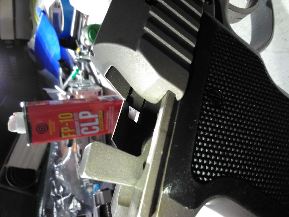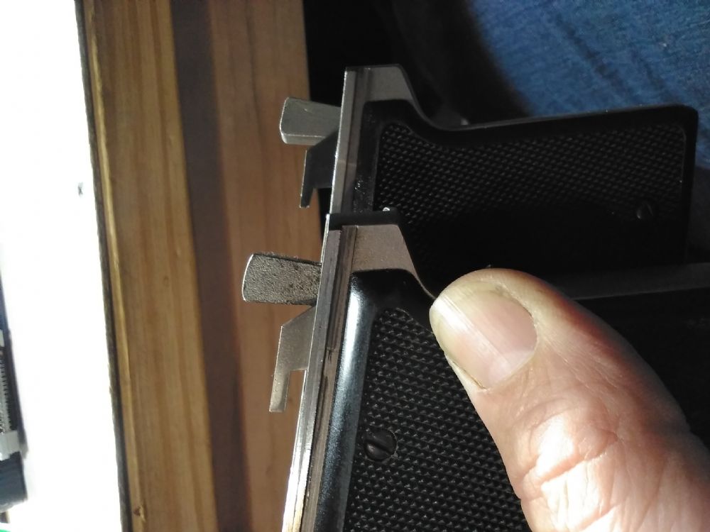 It turned my picture so lets say the front gun is a Galena and back is Irwindale. You can see how different the ejectors are. Original amt stands a fair bit taller and that is way the Galena slide wouldn't go on. Not to say that it couldn't be made to work with some gunsmithing.