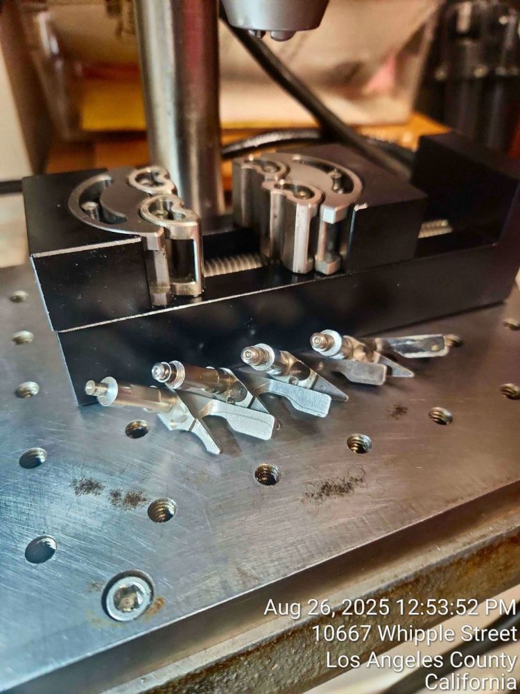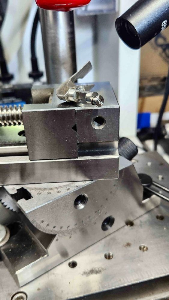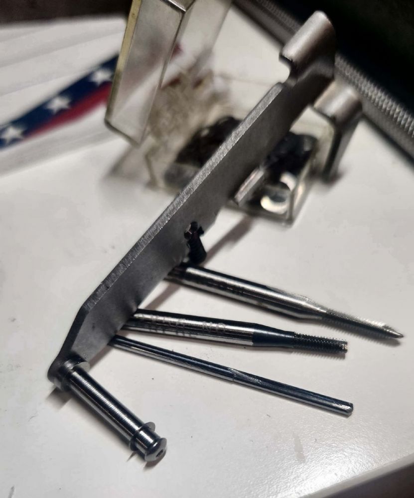 Here are a few newly modified Fail Safe Safety Levers. These have a 2/56 stainless screw installed. A Fractal vise is used to hold the lever & available on Amazon for $100.00 Servo drill press was used & drills used, solid carbide 2 straight flute. A transfer punch & bushing was used to center things up. ![]() |