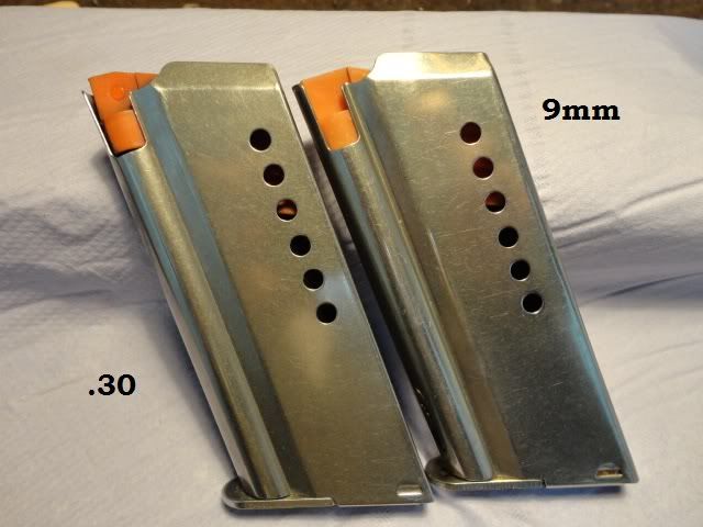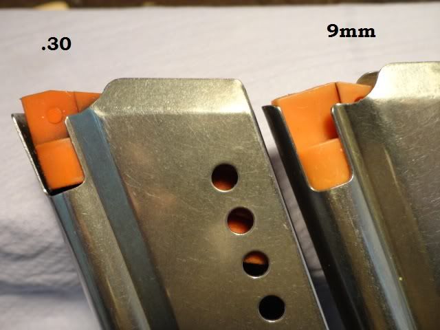 Thanks for shearing those pictures XPOO1.While I'm certainly NO expert on this, and I'm just talk about the guns I have, mine are different.To start, about the .30 and the 9mm magazines. (I dont have the whole pistol in 9mm, just 1 magazine)The 9mm mag I have does fit inside the 30 pistol, but the feeding is a dissaster, actually, it jams all the time.Here are the pictures from both magazines, you'll see why they dont work. Watch the magazine follower, the feed angle of the front part is much longer on the 9mm, and the .30 follower push the cartridge higher due to the change (wide) in feedlips. Not very well visible, but the 2 mags in front to each other. 9mm in front, 30 in the back. If you put both mags flat on the 'spine' you will see a small difference in the feedlips angle, not much but it is there! Here you can see clearly the difference of the followers and wide of the feedlips.