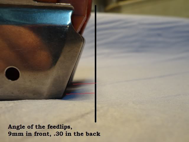 * The 9mm is wider(1/16”) and longer(back-to-front 1/16”) and front feed lip is taller(1/16”)