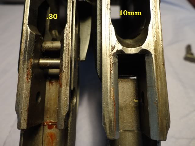 Here some more information about MY pistols.To start, my pistols are as follows: .30 = AMT10 mm = IAI.45 = IAI .50 = AMT Maybe that could explain some things? The line-up: Not much difference here, except for the .30 which is of course a smaller frame. The difference between the other 3 is minimal (at first sight) except that the slide on the .50 sits almost flush with the back of the frame compared to the others. Detailed picture below About the differences between the .30 and ALL other frames, the biggest difference is that the .30 frame has NO feedramp on the FRAME, and the barrel stops (rearward movement after unlocking) to a cross pin in the frame. All IV 's and V's (10mm, 45 and 50) have a feedramp built into the frame not on the barrels! Picture tells a 1000 words: Plenty more of this information is explained in the DVD "Automag pistols"