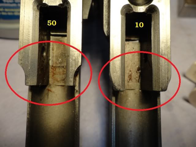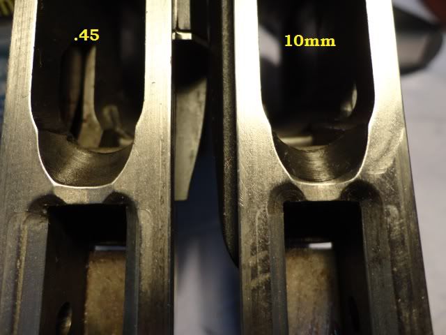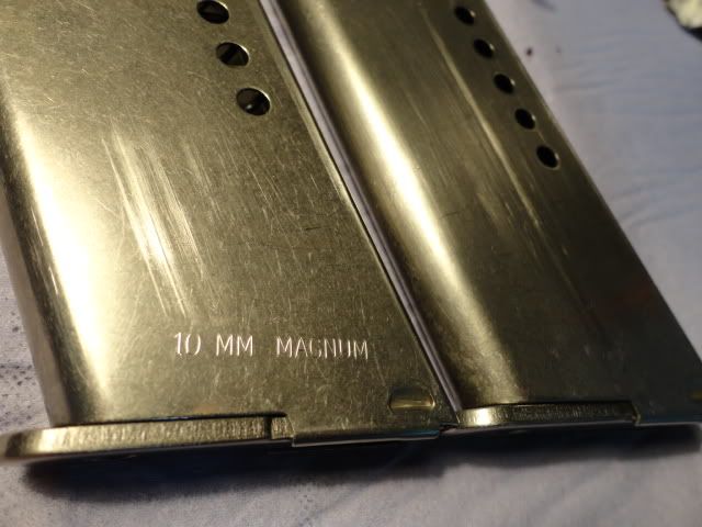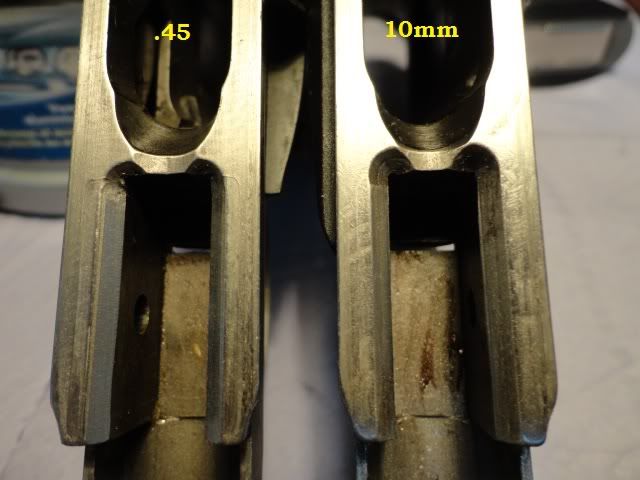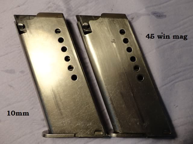 mohili...sorry, not pretty pics, you should have said greasy pics Just two more pics from the magazines of the 10 mm and 45 WinMag.Except for the minor distance (wide) in feedlips, they look alike. Well, to keep them appart and not haveing to measure them, I engraved my 10mm !
