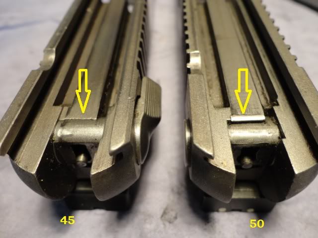 Now about the frames and feedramps of the IV's:My two IAI in 10mm and 45 winMag: Sliderails look identical on my two: But here the differences in wide between the feedramps 10 and the 45,note that the 10mm is smaller as the 45: One remark about the slides, just my .50 cal slide is marked 50 on the inside. (cast into the metal, not engraved) So my personal conclusion: All models have their own caliber frame/slide/barrel configuration, or quality control was a dissaster at AMT/IAI...  Or, what I remember what Lee Juras once told me, all automags are prototypes...