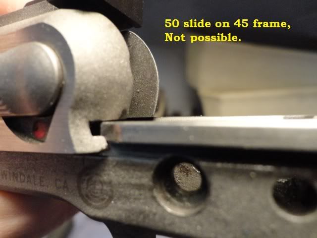 I do say the 50AE slide can fit onto the 45WinMag frame as Mine was a bastard gun by pervious owners/repair shop(not sure). Now if you can shoot 50AE from it I don't know cause of the feedramp question and also didn't try a 50AE mag into it. Remember just the slide was the bastard on my 45Winmag, not the BBL. Yes, "50"is cast into that slide not engraved, Sry didn't make that clear.