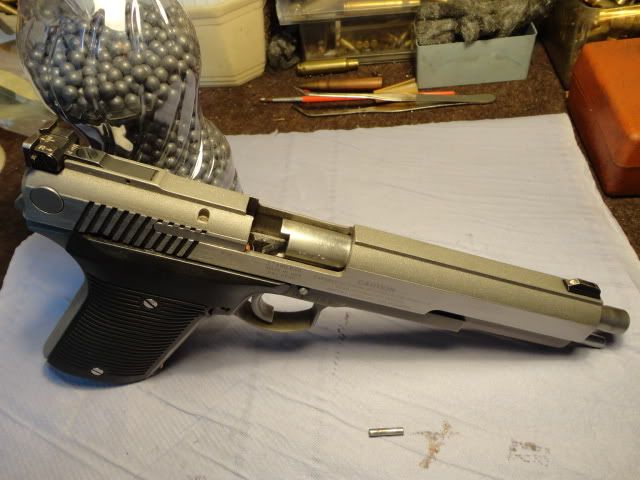 I was wrong about when I thought I cleaned, re-assmbled & dropped the pin and spring. Now that I been playing around with it, I realize that I haven't fired it since. It's an IAI Automag III, .30 Carbine and it has plain black front & rear sites, ring (lug?) on barrel and the barrel jams on the slide. I guess I'll have to dig out that pin & spring now.