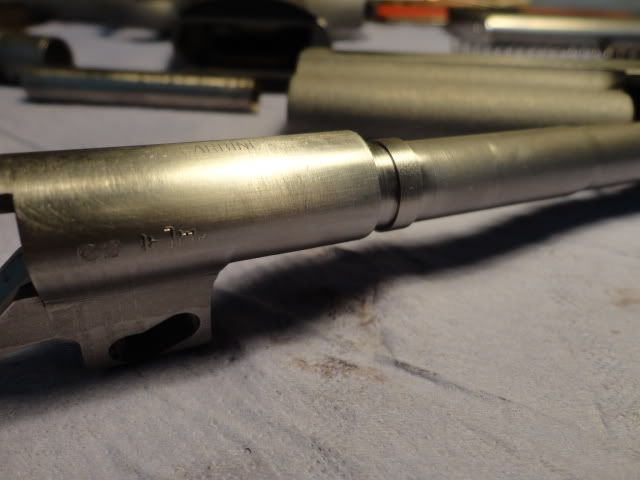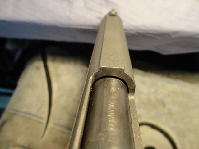 Oop, sorry I made a mistake in the earlier post, it was some time ago when this happend...So the problem with the spring and pin removed from the recoilrod... ...is not in retracting the slide back, but it does not goes all the way foreward. Some pictures of what happens if the pistol is assembled without the pin: This is where the slide jams on the barrel when the pin is not installed. (in foreward movement) Without that pin/spring, the barrel is moving to fast foreward and jams on the slide. A very slight push (to the rear) on the muzzle end of the barrel moves everything back into place. That is the reason this pin/spring is needed on MY pistol. It keeps the barrel a little longer to the rear (and down) so the slide has time to move freely over the "hood" of the barrel. The barrel "hood" is locking alot more into the slide as the barrel toplug. Conclusion: On my AMT, the barrel is locked in TWO places into the slide, at the slide's ejection port and in the groove inside the slide. Here some more questions for you all: how high is the barrel locked into the slide on your pistols. Barrel locked into slide: Unlocked: Just push the muzzle to hard surface and see how much it unlocks. Doing this will show you the maximum tilting of the barrel (unlocking) before the slide can move freely to the rear. Note the gap between barrel "hood" and slide, its huge on my III. I suspect it has to be that much to free the top barrellug (ring) out of the slide. The ammount of locking into the slide, the bright spots are the ammount of locking into the slide: And here some pics from the barrel lug (ring): It is not very big, but it does lock into the slide.