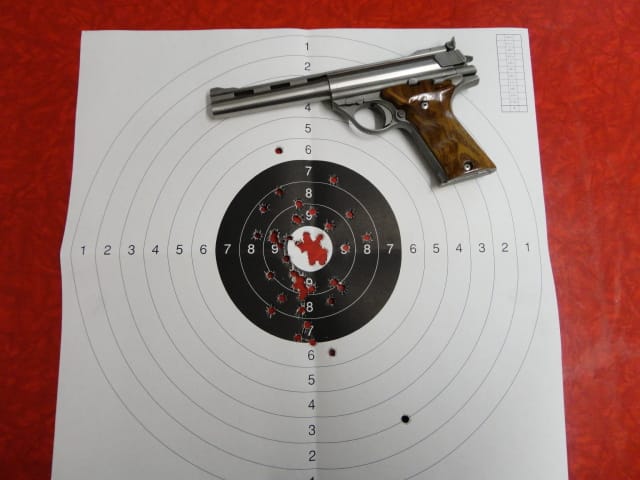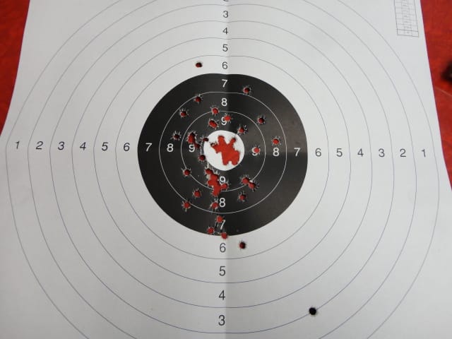 Hey Larry, I thought an update on this might be in place. I just shot the last of that reloaded batch today, and I stay with this load. Since powder has become an issue to find, this Ramshot is easy to get here (it's Belgian powder anyway) and I'm happy with the results. Below a picture of one of my targets I usually shoot with this load. 50 rounds shot in standing position, two hand held pistol, not resting on anything, and target at 25 meters. Just to show the pistol is not covering any other holes: Well, that's good enough for me to use in the future. |