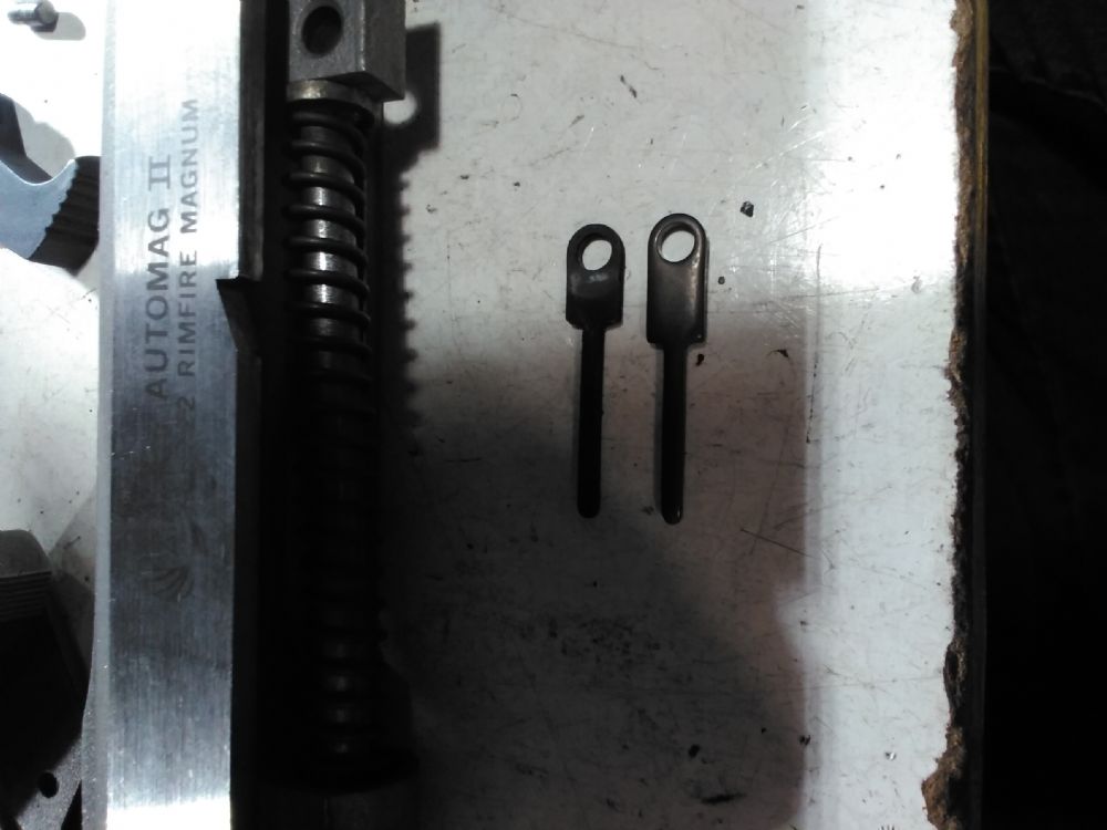 UPDATE: Again, I an NOT any authority on AMT or the AutoMag III. I merely possess one and am the second owner. Any of the parts on it are presumed to be ORIGINAL as the first owner would probably not have had any local gunsmithing done- but the chance of me being mistaken exists. This morning I received a phone call from Alan at InterArms in response to my email reflecting my findings (noted in the above post). He explained to me that He had the original blueprints and that all of the AutoMags used the same Hammer Strut. Adding that they have sold hundreds of them and I am the first to complain. I questioned the .050 thickness and other dimensional variations from the Strut that was installed (and functioned) in my unit? Again he said it was made from original blue prints and that I should install it and try it- then IF it doesn't function correctly to contact him. Still questioning the thickness I was told "The part is hardened. He bought a large stock of parts that was found to be "half hard" that he had melted down. These parts are hardened and should stand up." I went on to explain that it wasn't the money that concerned me as much as it 'apparently' was not an AutoMag III part and was again told to install it and if it doesn't work to contact him. [email response prior to phone call] Alan Aronstein Tue, Feb 18 at 7:58 PM We bought the AMT Company Assets in 2006. Those parts are made to the Factory Prints. We have sold hundreds of them and produced AutoMag II Pistols with them with NO issues. I think that you should try them in your pistol. - AlanI may well be wrong and doing a lot of assumptions, but at this point I have no intentions of trying out a Strut that I "think" is for an AutoMag II in my AutoMag III, UNLESS I'm convinced otherwise first. IF I AM WRONG, MY APOLOGIES TO ALAN.