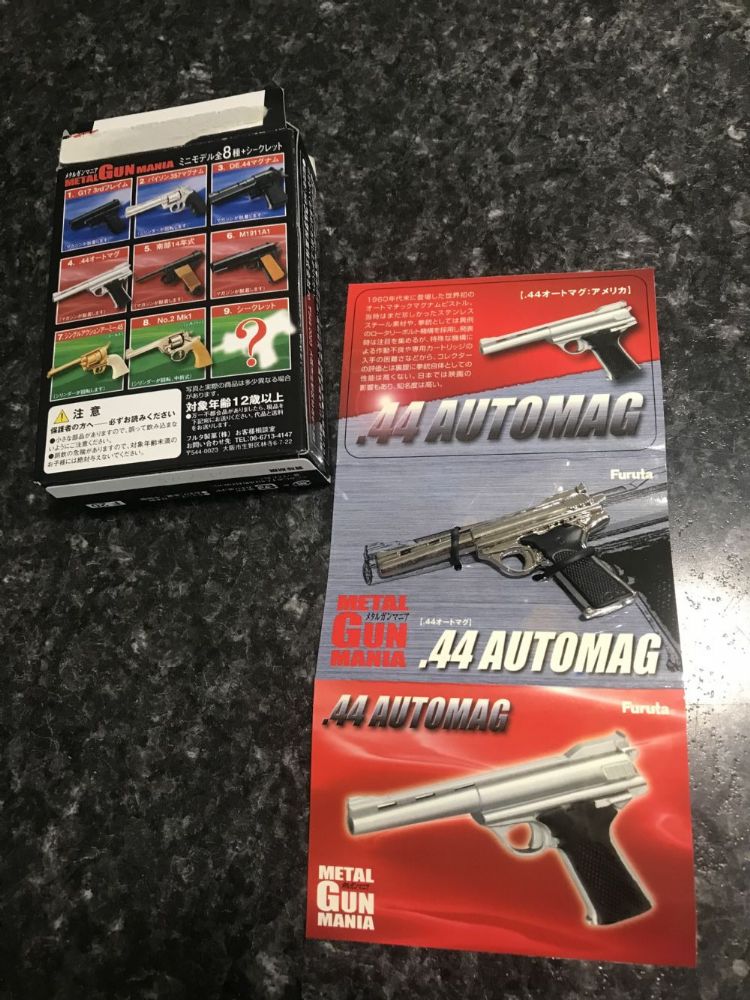 This metal Japanese toy is about an inch and a half long, mounted to a three fold card. The box doesn’t match the toy. The Auto Mag is pistol #4 and the box is for #8, an 1870 Schofield.
