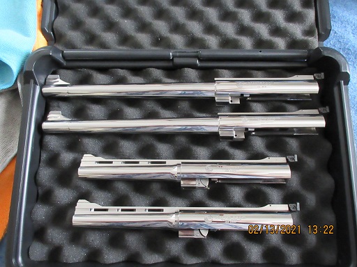 I have four barrels that were made at the Excel facility. Among them is a 10 1/2" plain barrel in 45 Win Mag marked Founder's Edition. I think that they were just trying out Patrick's new Laser Engraver. ![]() The four AMP's in the ads were all a part of the 29 pistols made at Excel's Shop by Larry Grossman. They utilized the old left over frame castings that Patrick bought from Walter. Larry built them and does terrific work but they do not have any of the improvements that the Loris made pistols have. ![]() ![]() ![]() |