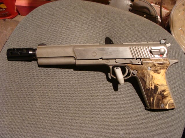 On page 129 in Brian Maynard's Auto Mag reference manual, he's talking about some IV's with a compensator. It would be nice to know if the one you have is original or later on added. Can you share some detailed pictures of the muzzle device, is it threaded to the barrel?What's the length of the barrel without the comp?Sorry for the many questions, I'm just curious about this one...