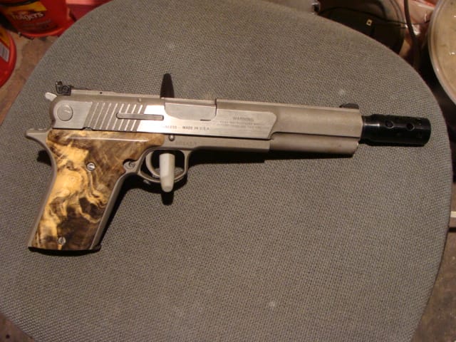 Splendid!Nice grips to.Just one thing I would do is remove that bluing and polish the compensator...Now get some starline brass, and some H110 and watch the fireballs...The 10mm Magnum has become one of my favorite cartridges, easy to load, many components to choose from. I load them with "regular" 10 mm dies.