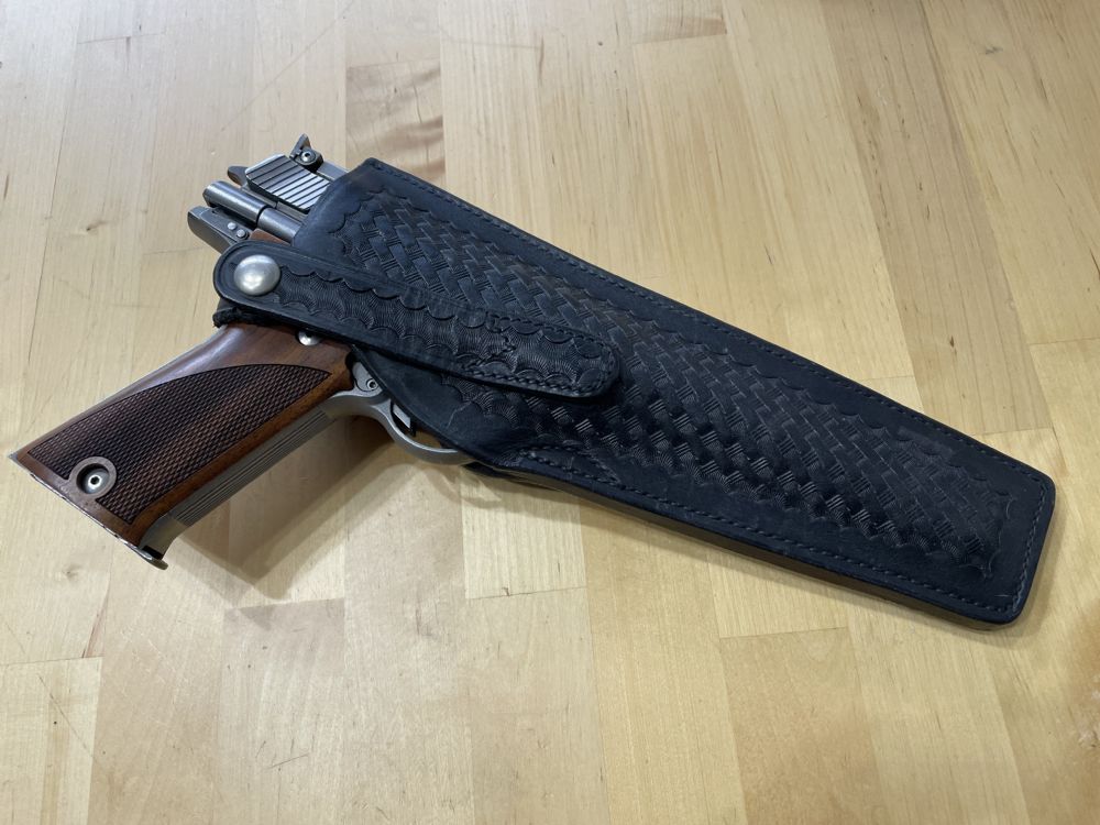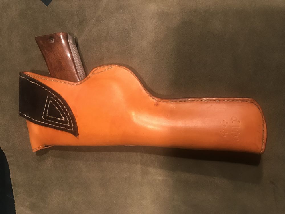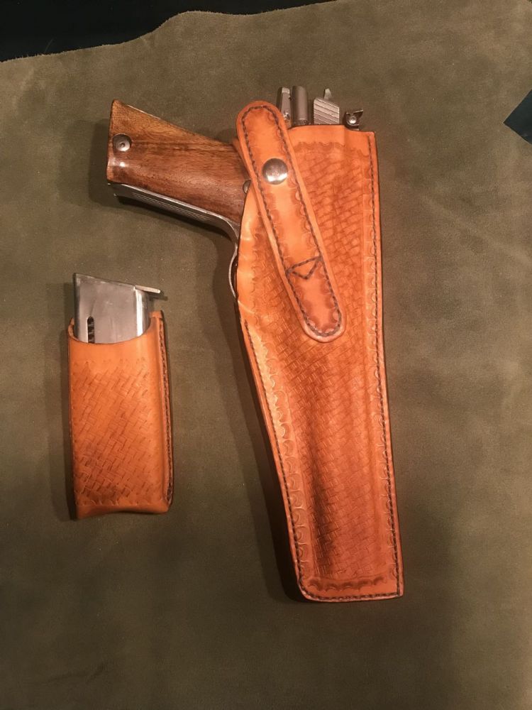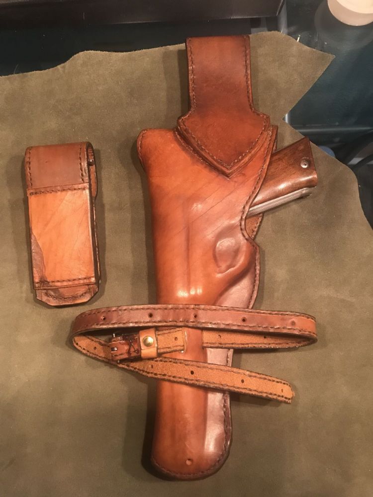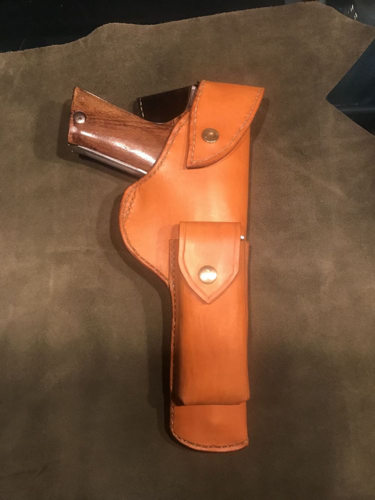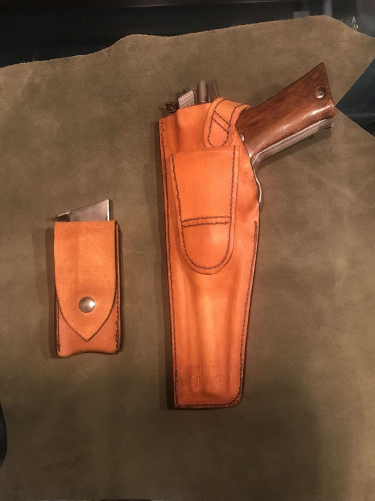 Anybody on the forum making their own holsters? I found an original Bianchi X15 shoulder holster at auction. But decided to put my leather making skills to the test and see if I could make my own. I have been working hard on creating holsters for the Auto Mag. I make my own paper patterns, from photos on the web of vintage holsters. I test fit the paper around my pistol, and if everything scales out right—then transfer to heavy card stock, then to leather. Cut, punch appropriate holes, stamp (or don’t), dye, stitch and finish the edges. Sometimes I wet the leather, saran wrap the pistol/mag and use a vacuum sealer instead of hand boning/forming to get the molded/custom look. It’s a lot easier on my hands! This is the first holster, a G.I. 1911 holster, lengthened to fit, and a mag pouch. I copied and carved the AM logo on the flap.
