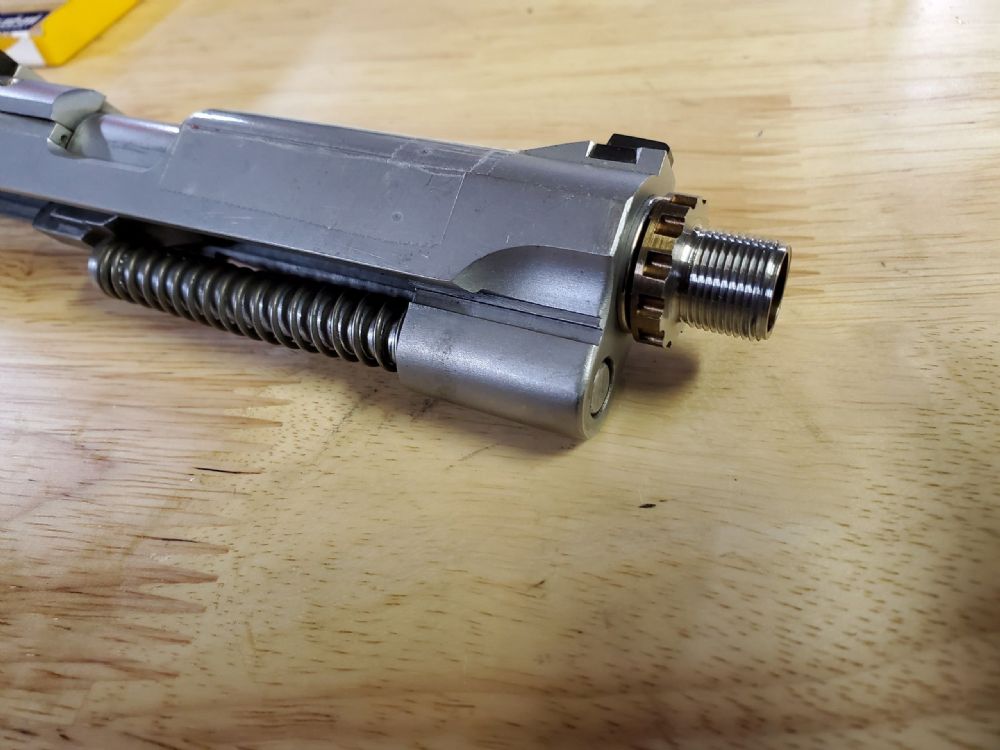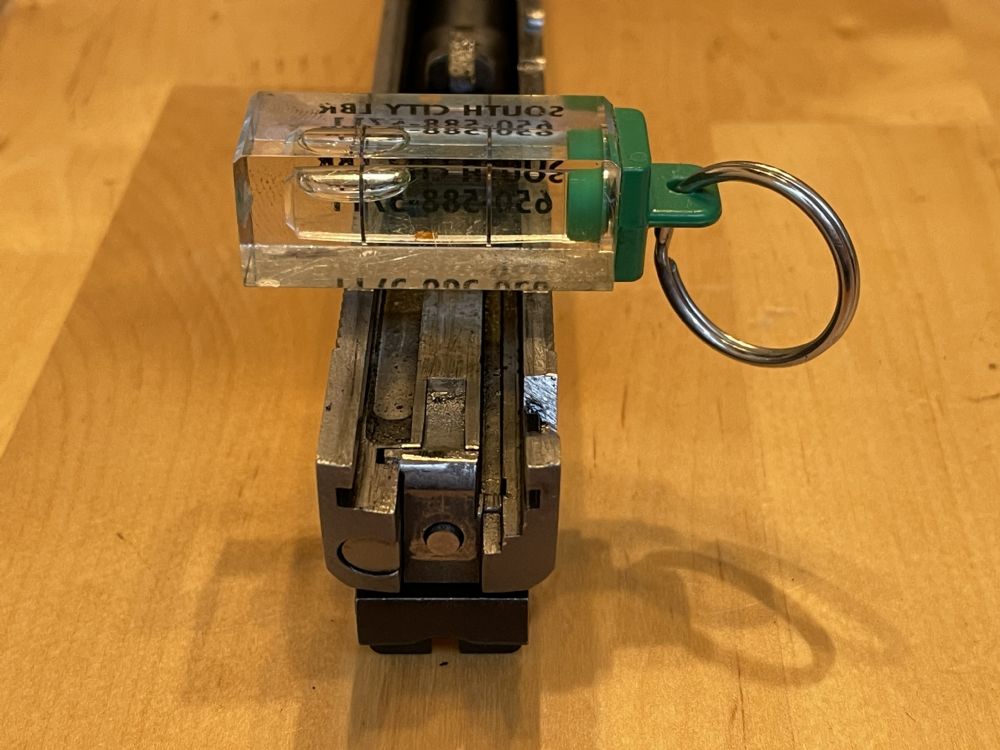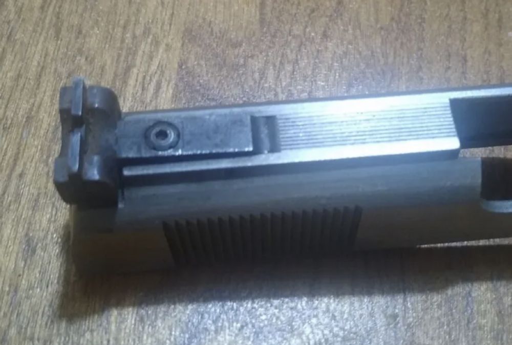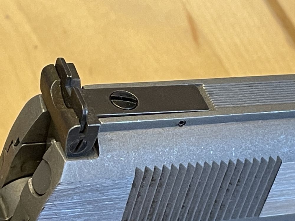 I also used a feeler gauge between the bottom of the sight and top of the slide, in an effort to preserve sight alignment, and then changed out the elevation screw for my spare which I had previously treated to Vibra-Tite. The old one came out effortlessly while the coated one took measurable (but not unreasonable) effort to install. Here is the old uncoated screw afterwards (I hadn’t noticed that the slot was in much better shape)