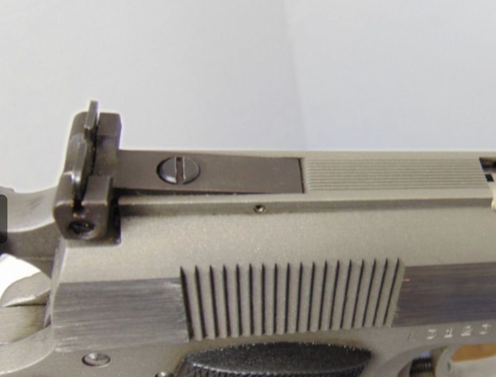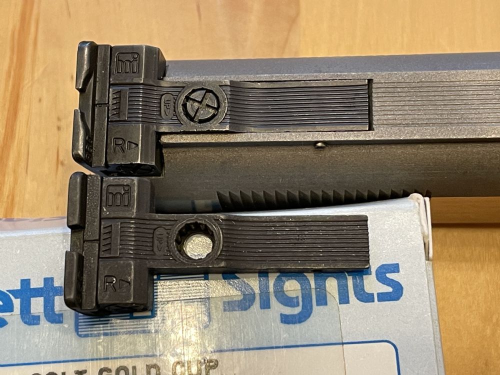 Shorter in overall length to the Millett Gold Cup sight used on the later guns, pin hole further aft, elevation screw further forward—it checks ALL the boxes.