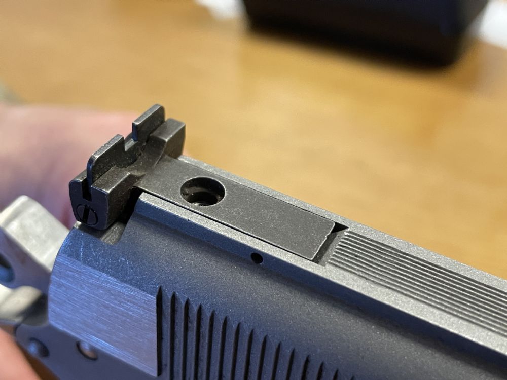 My Javelina sight has the same dimensions as a Colt Gold Cup and I found and bought a Millett Gold Cup sight (which isn’t here yet). However in looking at this gun I see that the sight is shorter in length. So adapting this sight to this gun would either demand milling the sight channel to make it longer or chopping the front end off the sight and drilling a new hole to mount it.