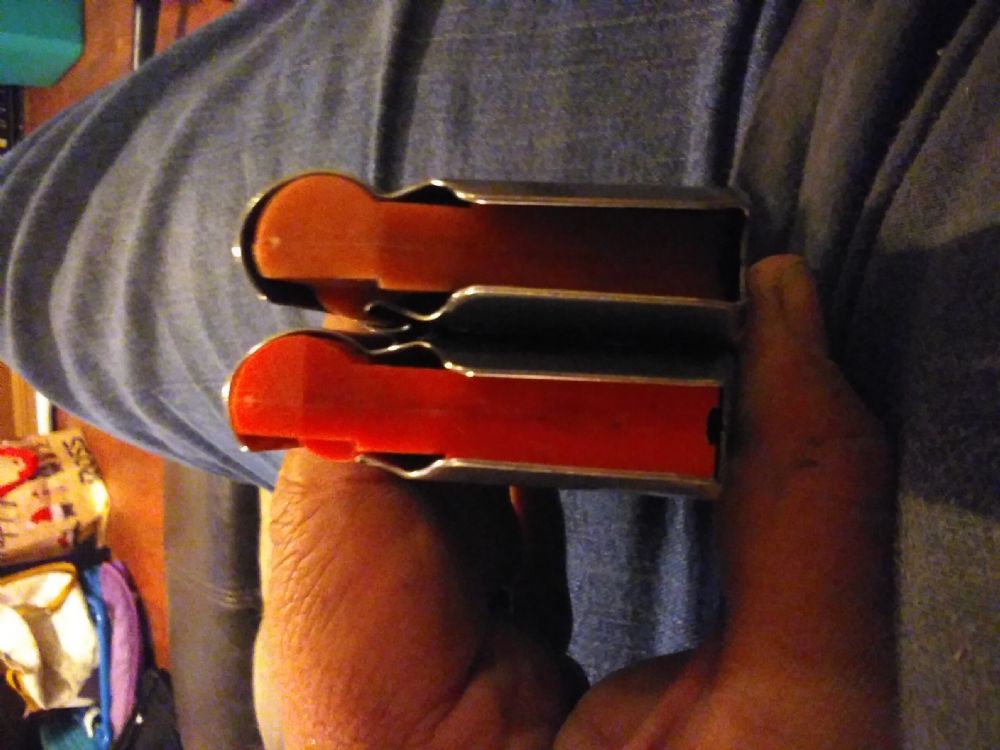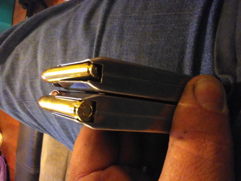 The mags on the right have a follower with a flatter profile at the end and are purportedly from 30 carbine guns. The one on the left has a black follower and is from a 9mm gun. |